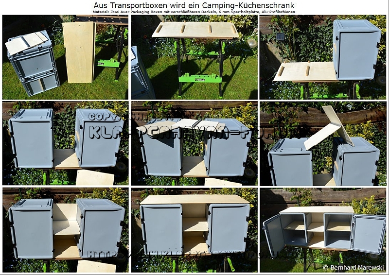 Aus Transportboxen wird ein Camping-Küchenschrank.