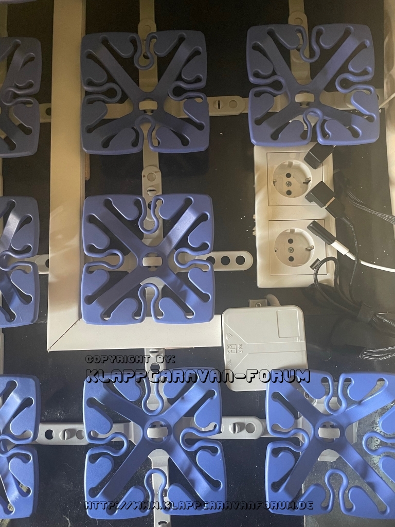 Von außen wird der Strom zentral über die CE-Buchse unterhalb der Zeltplattform eingespeist. Mit Kabelkanälen wird der Strom unterhalb der Matratze zu Doppelsteckdosen am Kopf- und Fußende verteilt sowie im Laderaum zur Versorgung der Campingküche.