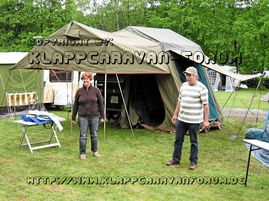 Rollo mit Frau, vor ihrem tollen Selbstbau-Falter. Der Hänger wurde von Rollo selbst gebaut, das Zelt kommt aus Südafrika von HowlingMoon.
