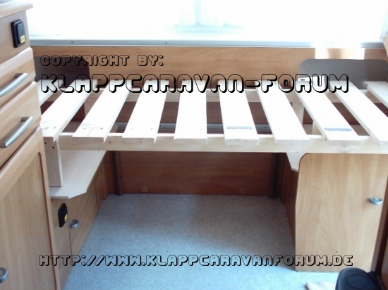 Bild 5: Der Minilattenrost steht einfach lose da. Während der Fahrt werden die Polster aufgelegt und eine Baumwoll-Bettauflage darüber gelegt (statt Bettlaken - schlaffertig!), deshalb kann er nicht verrutschen.