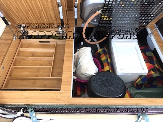 Unter dem Besteckkasten ist das gesamte Essgeschirr und ineinander gestapelte Plastikkisten für die Vorräte auf dem Platz (wir kaufen aber normalerweise erst vor Ort ein, da auch dies für uns zum Urlaub gehört - Supermarkt und Lebensmittel in anderen Ländern/Regionen).