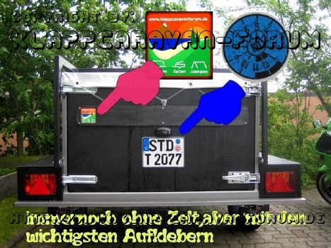 Endlich geschafft - Noch ohne Zelt, aber mit den wichtigsten Aufklebern.
