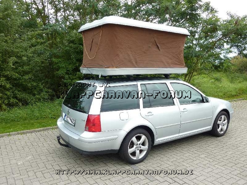 Dann bin ich im Netz, genauer gesagt auf Marktplaats.nl auf dieses Dachzelt gestoßen. Es ist ca. 2,00m lang, 1,20m breit und 0,90m hoch (geschlossen 0,28m). Hab dann angerufen und 2 Tage später war ich auch schon da. Den Zustand für gut befunden, den Preis natürlich noch ein bißchen gedrückt und dann das gute Stück mitgenommen.